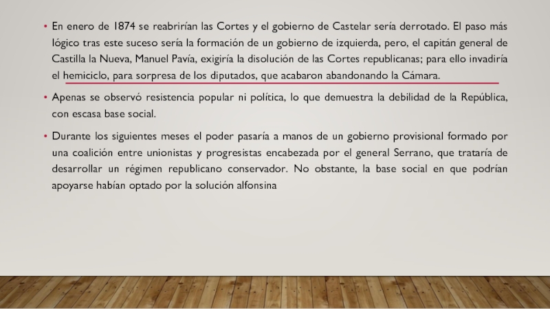 Слайд 10En enero de 1874 se reabrirían las Cortes y el