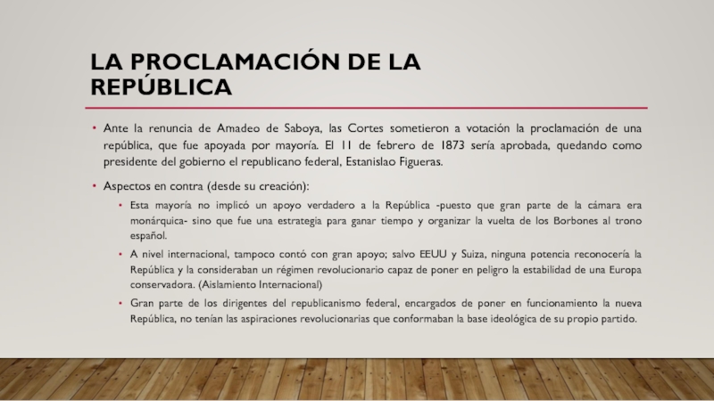 que fue apoyada por mayoría. El 11 de febrero de 1873 sería aprobada, quedando como presidente del gobierno el republicano federal, Estanislao Figueras.