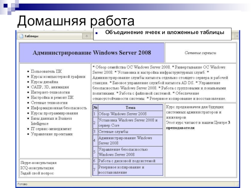Домашняя работаОбъединение ячеек и вложенные таблицы