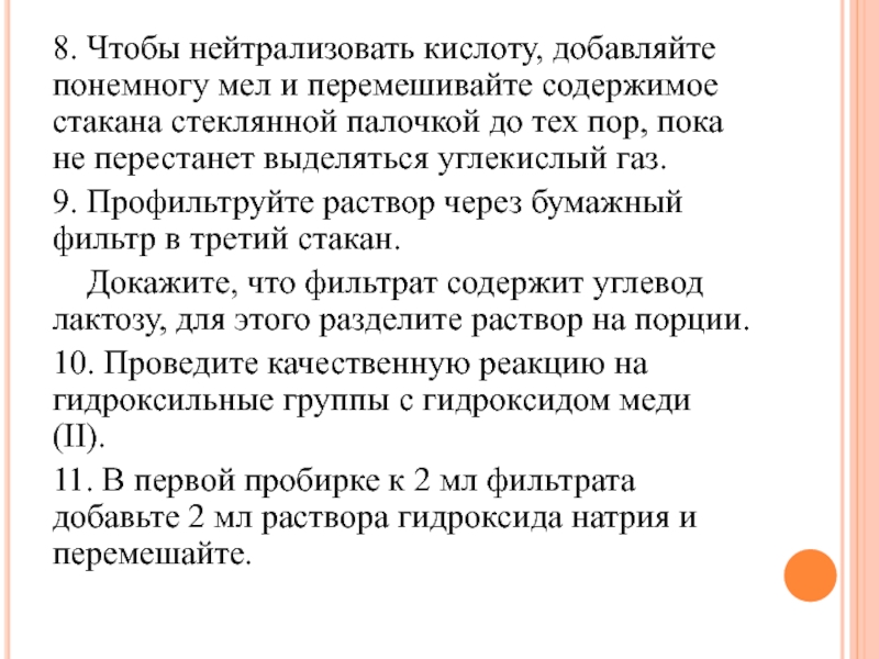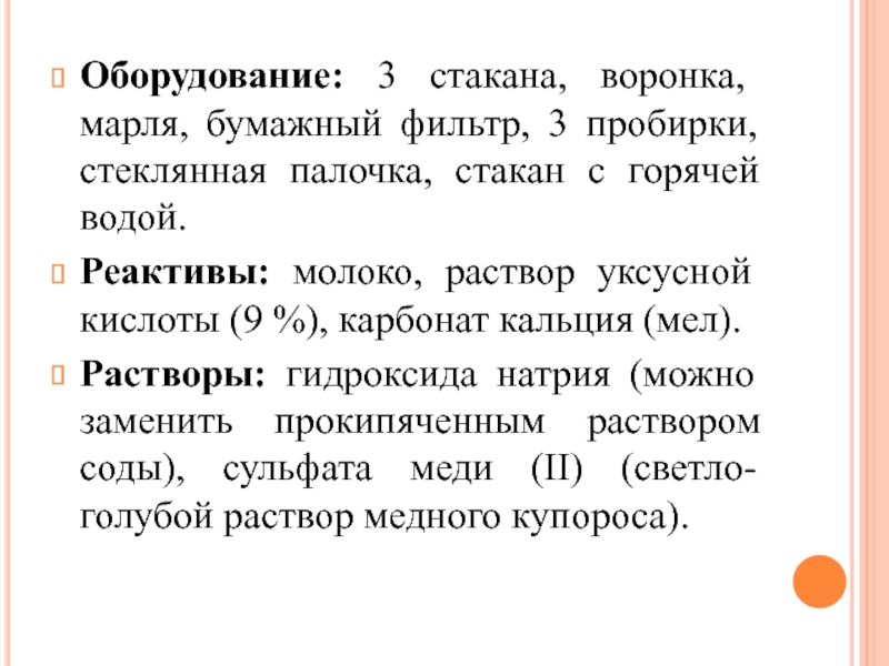 %), карбонат кальция (мел).Растворы: гидроксида натрия (можно заменить прокипяченным раствором соды), сульфата меди (II) (светло-голубой раствор медного купороса).