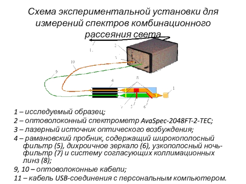Слайд 2Схема экспериментальной установки для измерений спектров комбинационного рассеяния света