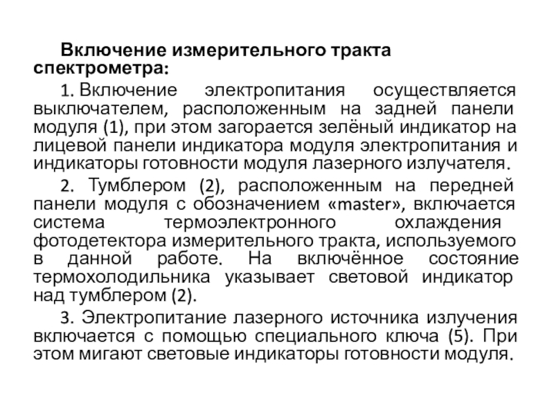 2. Тумблером (2), расположенным на передней панели модуля с обозначением «master», включается система термоэлектронного охлаждения фотодетектора измерительного тракта, используемого в данной работе. На включённое состояние термохолодильника указывает световой индикатор над тумблером (2).
