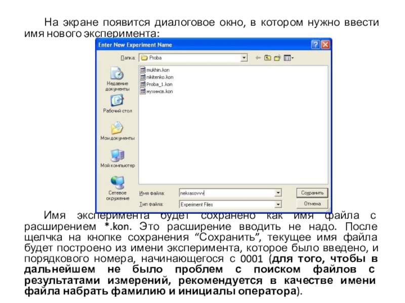 *.kon. Это расширение вводить не надо. После щелчка на кнопке сохранения “Сохранить”, текущее имя файла будет построено из имени эксперимента, которое было введено, и порядкового номера, начинающегося с 0001 (для того, чтобы в дальнейшем не было проблем с поиском файлов с результатами измерений, рекомендуется в качестве имени файла набрать фамилию и инициалы оператора).