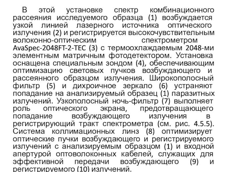 волоконно-оптическим спектрометром AvaSpec-2048FT-2-TEC (3) с термоохлаждаемым 2048-ми элементным матричным фотодетектором. Установка оснащена специальным зондом (4), обеспечивающим оптимизацию световых пучков возбуждающего и рассеянного образцом излучения. Широкополосный фильтр (5) и дихроичное зеркало (6) устраняют попадание на анализируемый образец (1) паразитных излучений. Узкополосный ночь-фильтр (7) выполняет роль оптического экрана, предотвращающего попадание возбуждающего излучения в регистрирующий тракт спектрометра (см. рис. 4.5.5). Система коллимационных линз (8) оптимизирует оптические пучки возбуждающего и регистрируемого излучений с анализируемым образцом (1) и входной апертурой оптоволоконных кабелей, служащих для эффективной передачи возбуждающего (9) и регистрируемого (10) излучений.