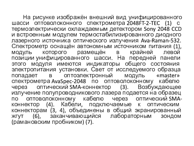 термостабилизированного диодного лазерного источника оптического излучения Ava-Raman-532. Спектрометр оснащён автономным источником питания (1), модуль которого размещён в крайней левой позиции унифицированного шасси. На передней панели этого модуля имеются индикаторы общего состояния электропитания установки. Свет от исследуемого образца попадает в оптоэлектронный модуль «master» спектрометра AvaSpec-2048 по оптоволоконному кабелю через оптический SMA-коннектор (3). Возбуждающее излучение полупроводникового лазера подается на образец по оптоволоконному кабелю через оптический SMA-коннектор (4). Кабели, подключаемые к оптическим коннекторам (3, 4), объединены в общий экранированный жгут (6), заканчивающийся лабораторным зондом (рамановским пробником) (7).
