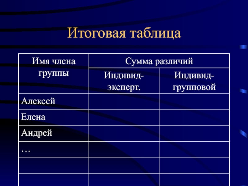 Каждый подсчитывает разницу между своим ответом, ответом группы и экспертов по каждой позиции. Разности суммируются. Ответы записываются в соответствующий столбец.