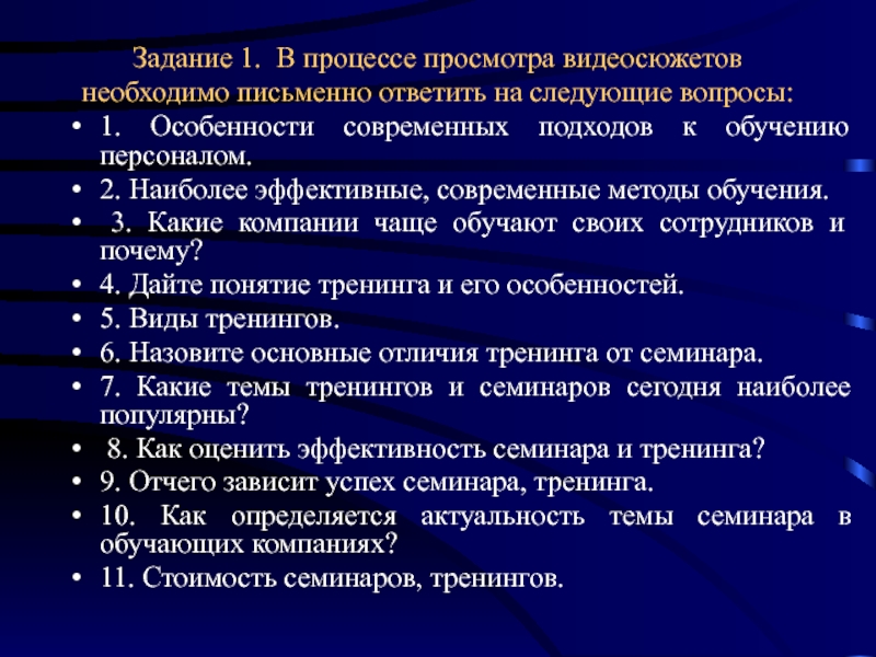 Слайд 3Задание 1. В процессе просмотра видеосюжетов необходимо письменно ответить на
