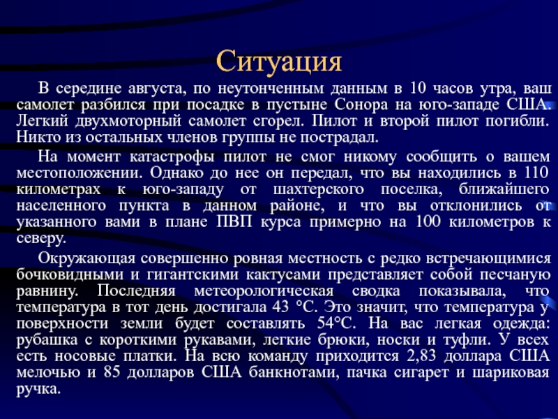 Окружающая совершенно ровная местность с редко встречающимися бочковидными и гигантскими кактусами представляет собой песчаную равнину. Последняя метеорологическая сводка показывала, что температура в тот день достигала 43 °C. Это значит, что температура у поверхности земли будет составлять 54°C. На вас легкая одежда: рубашка с короткими рукавами, легкие брюки, носки и туфли. У всех есть носовые платки. На всю команду приходится 2,83 доллара США мелочью и 85 долларов США банкнотами, пачка сигарет и шариковая ручка.