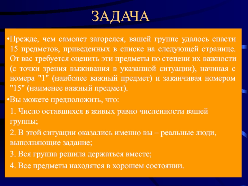 эти предметы по степени их важности (с точки зрения выживания в указанной ситуации), начиная с номера "1" (наиболее важный предмет) и заканчивая номером "15" (наименее важный предмет).
