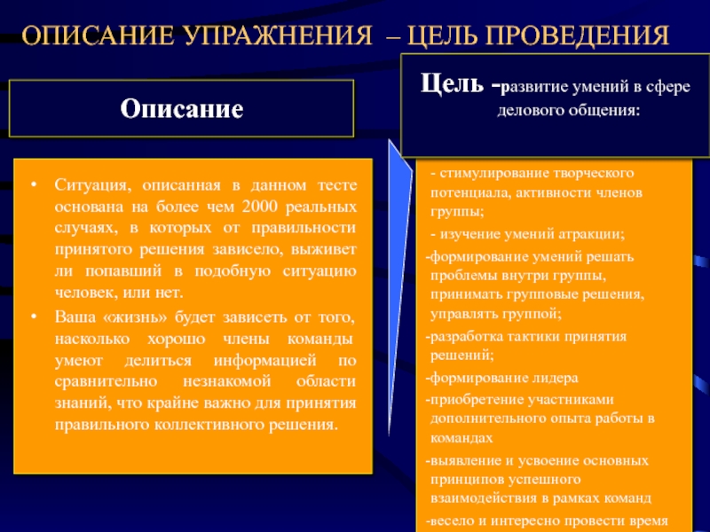 Слайд 5ОПИСАНИЕ УПРАЖНЕНИЯ – ЦЕЛЬ ПРОВЕДЕНИЯ