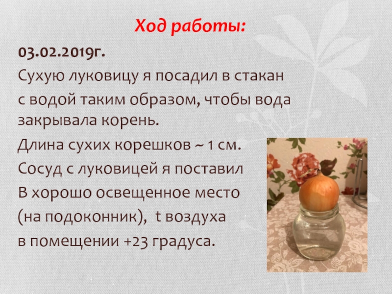 Ход работы:03.02.2019г. Сухую луковицу я посадил в стакан с водой таким образом, чтобы вода закрывала корень. Длина