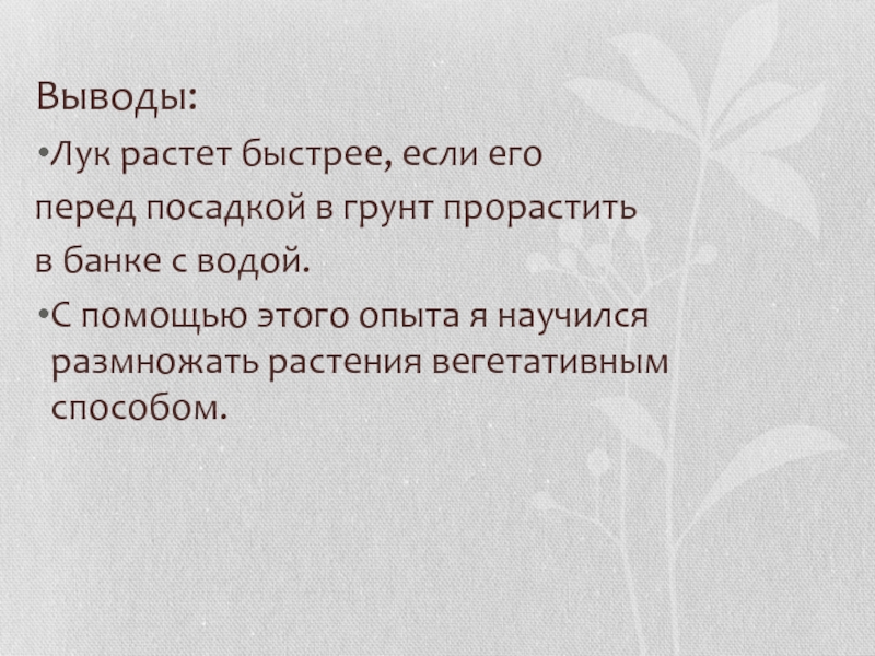 Выводы:Лук растет быстрее, если его перед посадкой в грунт прорастить в банке с водой.С помощью этого опыта