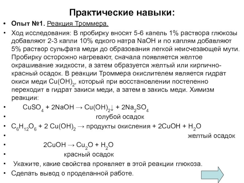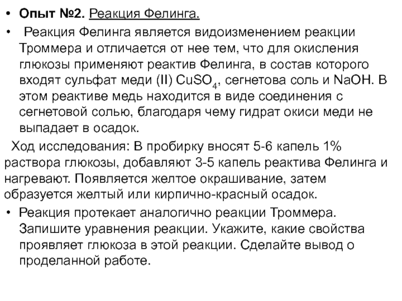 Реакция протекает аналогично реакции Троммера. Запишите уравнения реакции. Укажите, какие свойства проявляет глюкоза в этой реакции. Сделайте вывод о проделанной работе.
