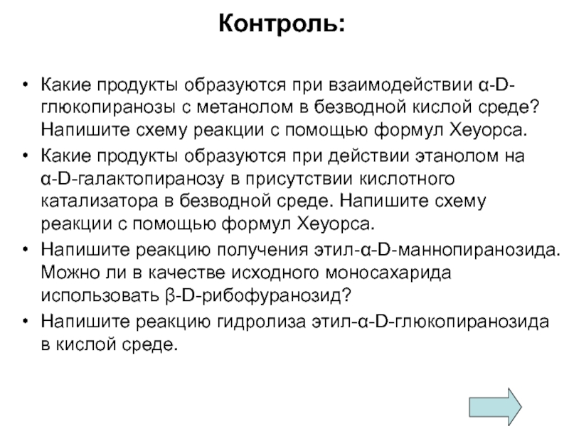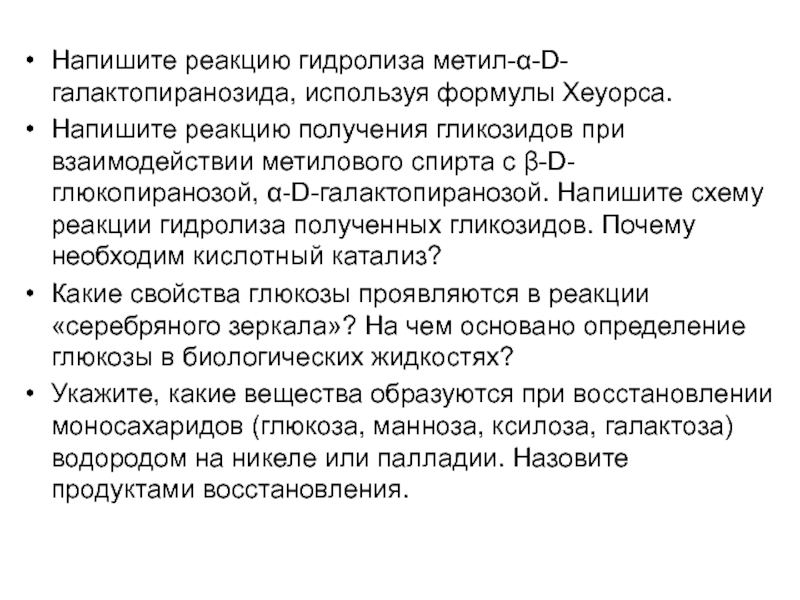 Слайд 10Напишите реакцию гидролиза метил-α-D-галактопиранозида, используя формулы Хеуорса.