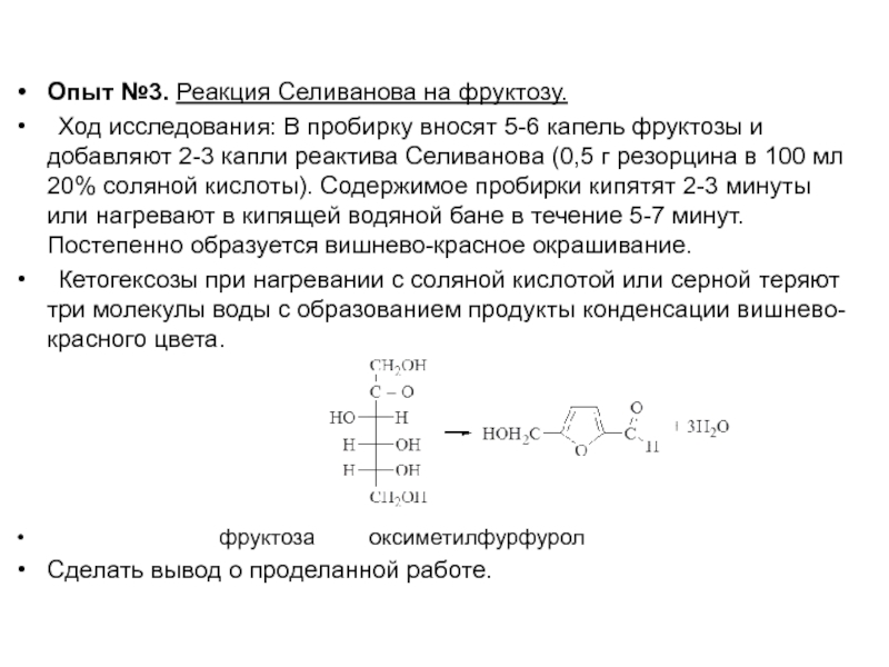 Слайд 13Опыт №3. Реакция Селиванова на фруктозу.