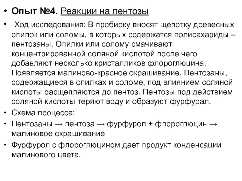 Опилки или солому смачивают концентрированной соляной кислотой после чего добавляют несколько кристалликов флороглюцина. Появляется малиново-красное окрашивание. Пентозаны, содержащиеся в опилках и соломе, под влиянием соляной кислоты расщепляются до пентоз. Пентозы под действием соляной кислоты теряют воду и образуют фурфурал.