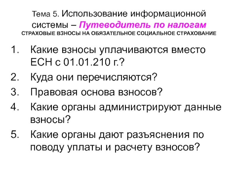 Слайд 60Тема 5. Использование информационной системы – Путеводитель по налогам СТРАХОВЫЕ