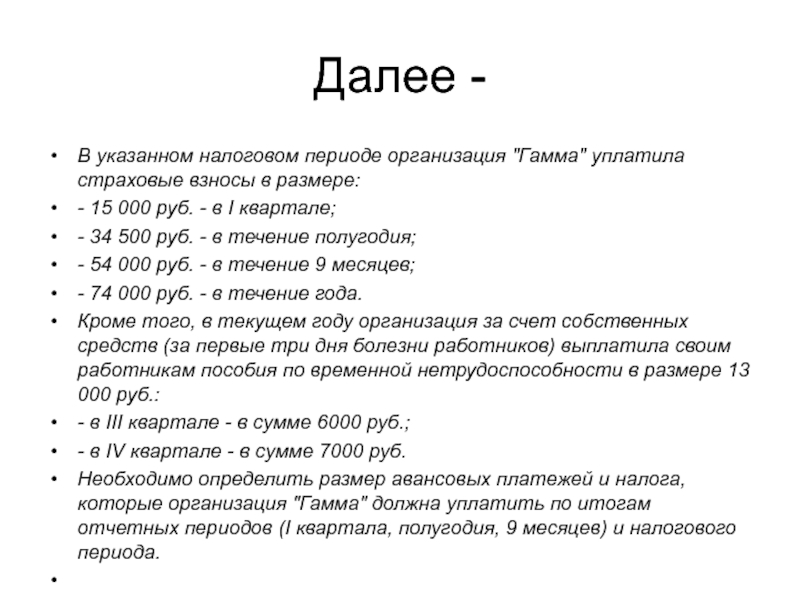 Необходимо определить размер авансовых платежей и налога, которые организация "Гамма" должна уплатить по итогам отчетных периодов (I квартала, полугодия, 9 месяцев) и налогового периода.