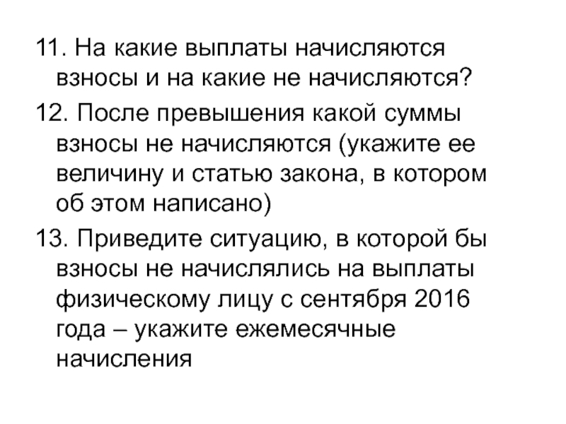 13. Приведите ситуацию, в которой бы взносы не начислялись на выплаты физическому лицу с сентября 2016 года – укажите ежемесячные начисления