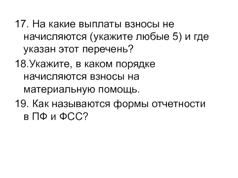 Слайд 6517. На какие выплаты взносы не начисляются (укажите любые 5)