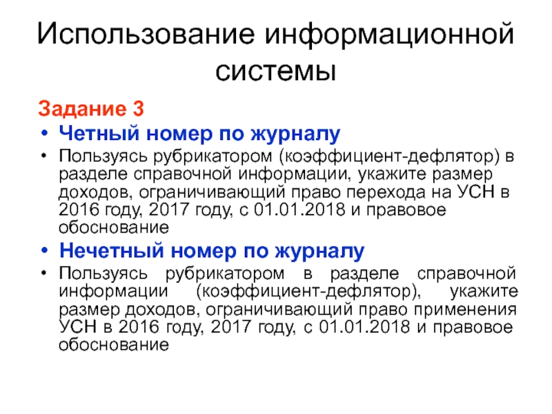 Пользуясь рубрикатором в разделе справочной информации (коэффициент-дефлятор), укажите размер доходов, ограничивающий право применения УСН в 2016 году, 2017 году, с 01.01.2018 и правовое обоснование