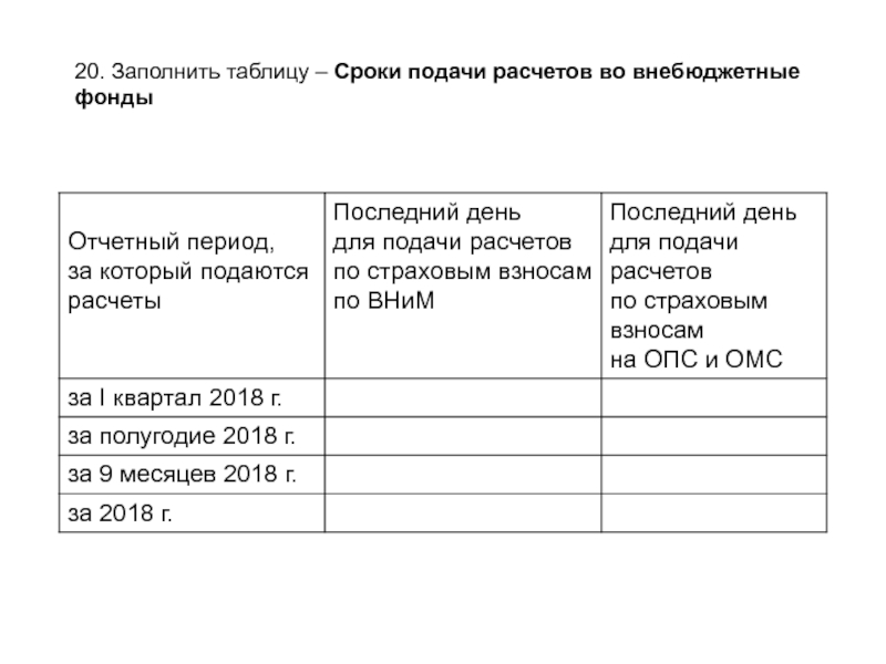Слайд 6620. Заполнить таблицу – Сроки подачи расчетов во внебюджетные фонды
