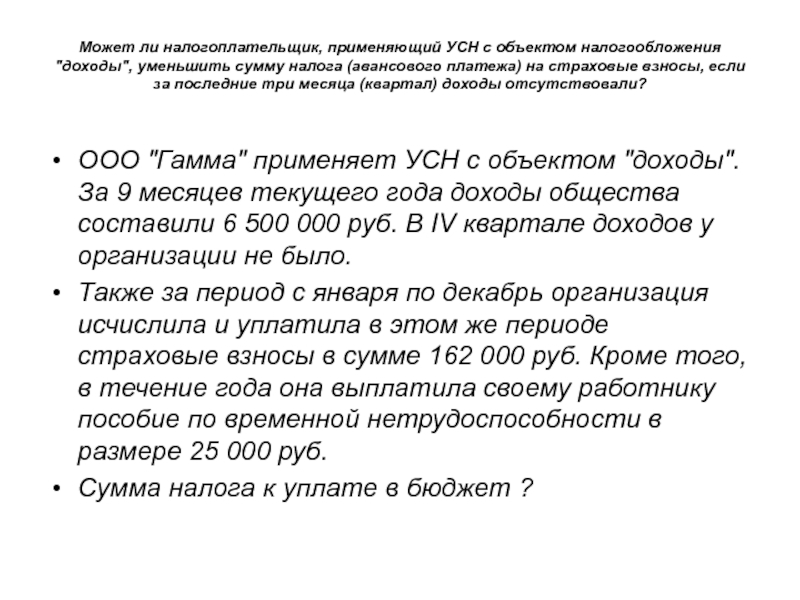 ООО "Гамма" применяет УСН с объектом "доходы". За 9 месяцев текущего года доходы общества составили 6 500 000 руб. В IV квартале доходов у организации не было.