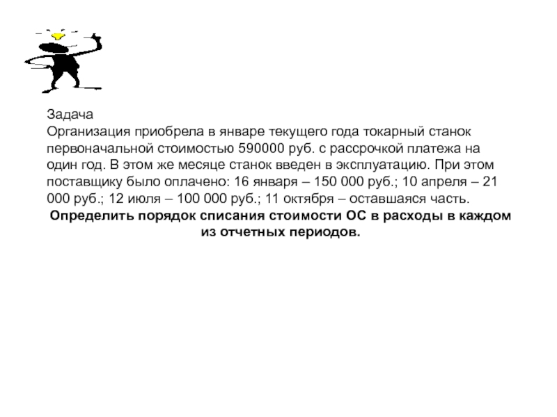 же месяце станок введен в эксплуатацию. При этом поставщику было оплачено: 16 января – 150 000 руб.; 10 апреля – 21 000 руб.; 12 июля – 100 000 руб.; 11 октября – оставшаяся часть.