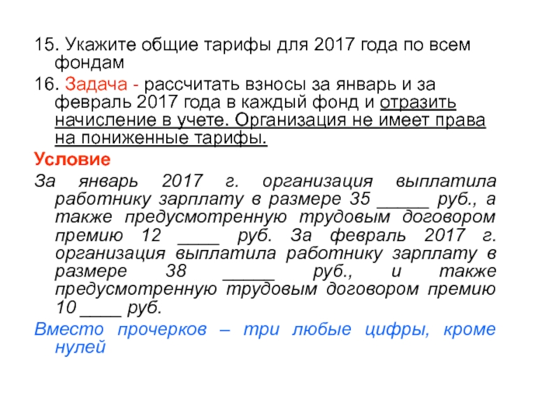 Слайд 6415. Укажите общие тарифы для 2017 года по всем фондам