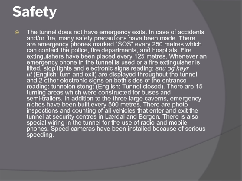 Safety  The tunnel does not have emergency exits. In case of accidents and/or fire,