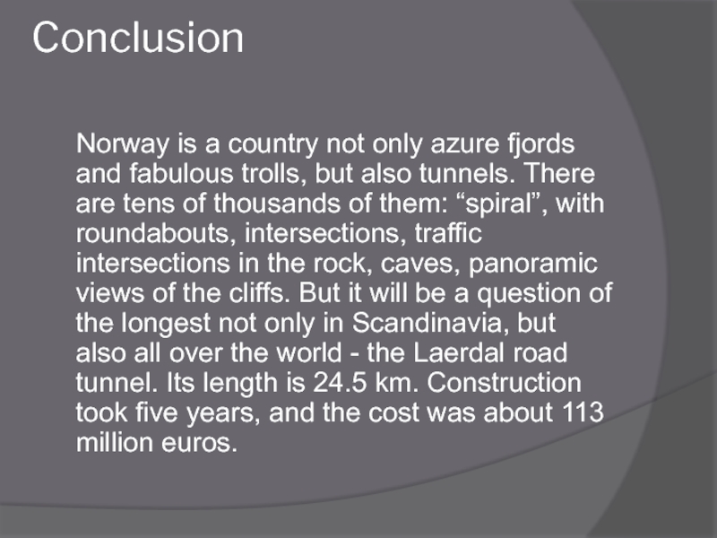 Conclusion  Norway is a country not only azure fjords and fabulous trolls, but also tunnels. There