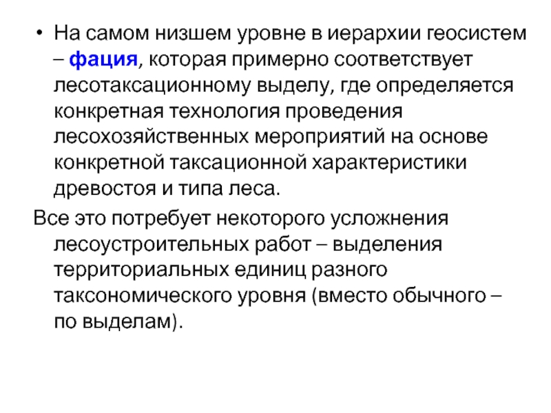 Слайд 22На самом низшем уровне в иерархии геосистем – фация, которая