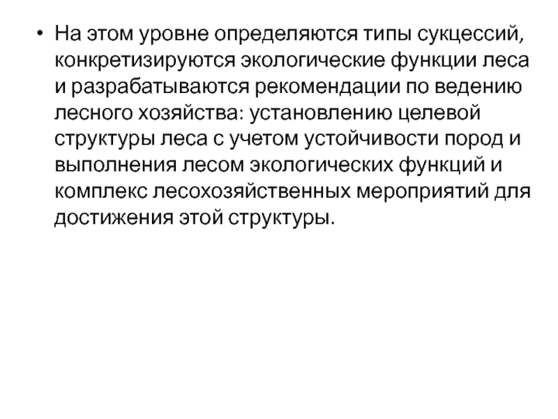 Слайд 21На этом уровне определяются типы сукцессий, конкретизируются экологические функции леса
