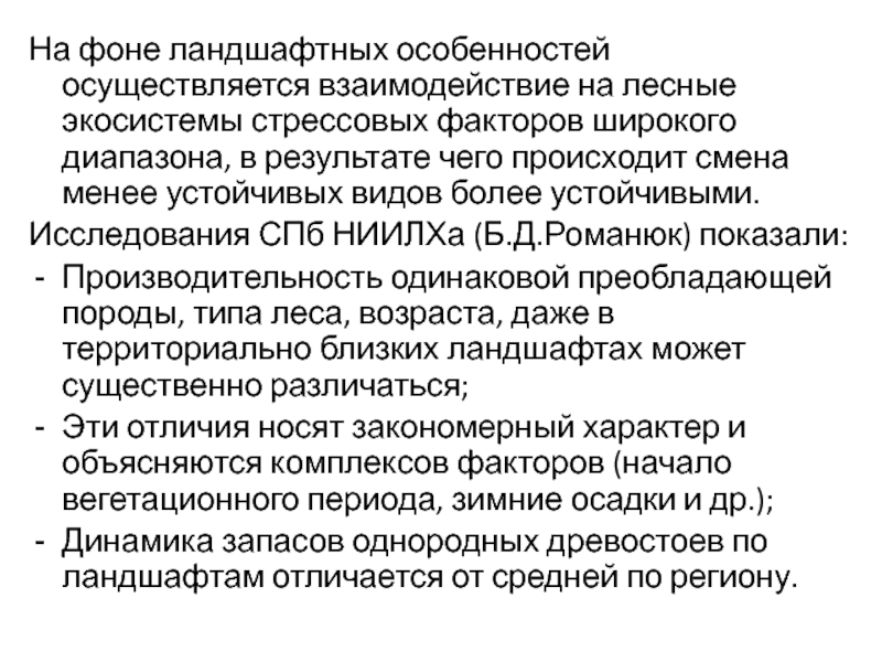 Слайд 12На фоне ландшафтных особенностей осуществляется взаимодействие на лесные экосистемы стрессовых