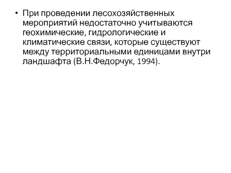 Слайд 24При проведении лесохозяйственных мероприятий недостаточно учитываются геохимические, гидрологические и климатические