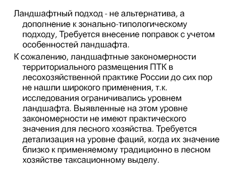 закономерности территориального размещения ПТК в лесохозяйственной практике России до сих пор не нашли широкого применения, т.к. исследования ограничивались уровнем ландшафта. Выявленные на этом уровне закономерности не имеют практического значения для лесного хозяйства. Требуется детализация на уровне фаций, когда их значение близко к применяемому традиционно в лесном хозяйстве таксационному выделу.