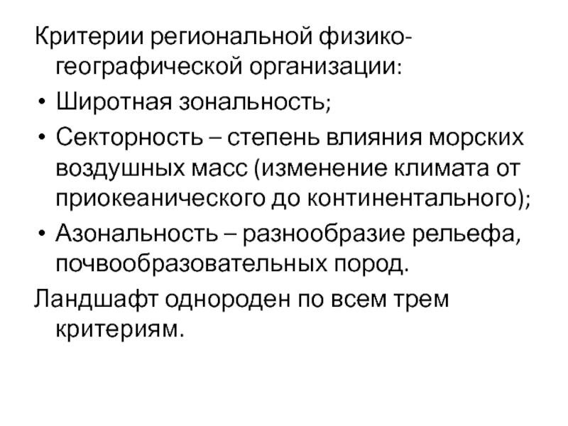 общим климатом, единообразным сочетанием гидротермических условий, почв, биоценозов и специфическим планом морфологического строения.»