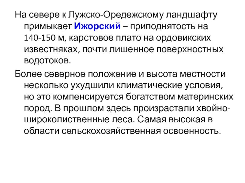 Слайд 32На севере к Лужско-Оредежскому ландшафту примыкает Ижорский – приподнятость на