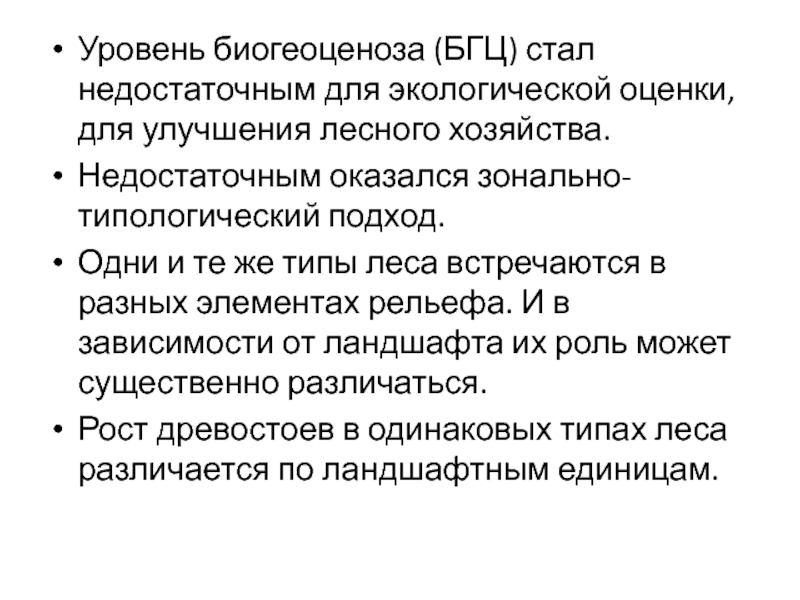 Слайд 4Уровень биогеоценоза (БГЦ) стал недостаточным для экологической оценки, для улучшения