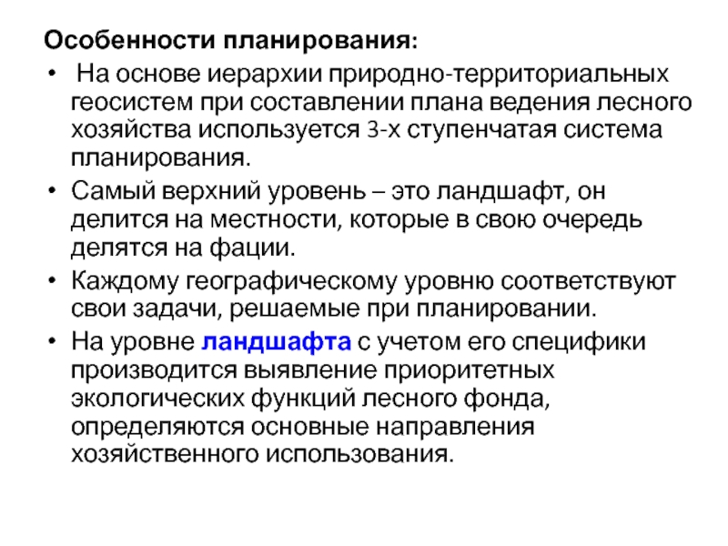 На уровне ландшафта с учетом его специфики производится выявление приоритетных экологических функций лесного фонда, определяются основные направления хозяйственного использования.