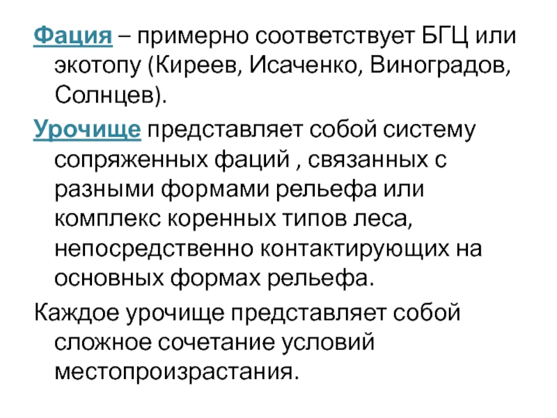 Слайд 10Фация – примерно соответствует БГЦ или экотопу (Киреев, Исаченко, Виноградов,
