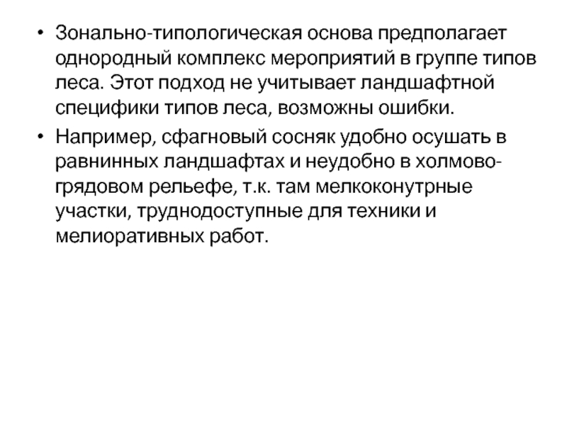Например, сфагновый сосняк удобно осушать в равнинных ландшафтах и неудобно в холмово-грядовом рельефе, т.к. там мелкоконутрные участки, труднодоступные для техники и мелиоративных работ.