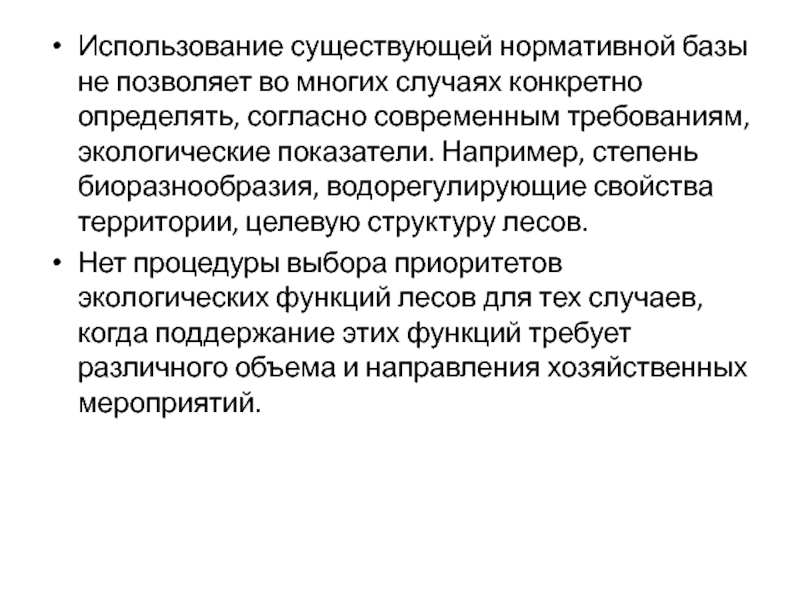 Нет процедуры выбора приоритетов экологических функций лесов для тех случаев, когда поддержание этих функций требует различного объема и направления хозяйственных мероприятий.