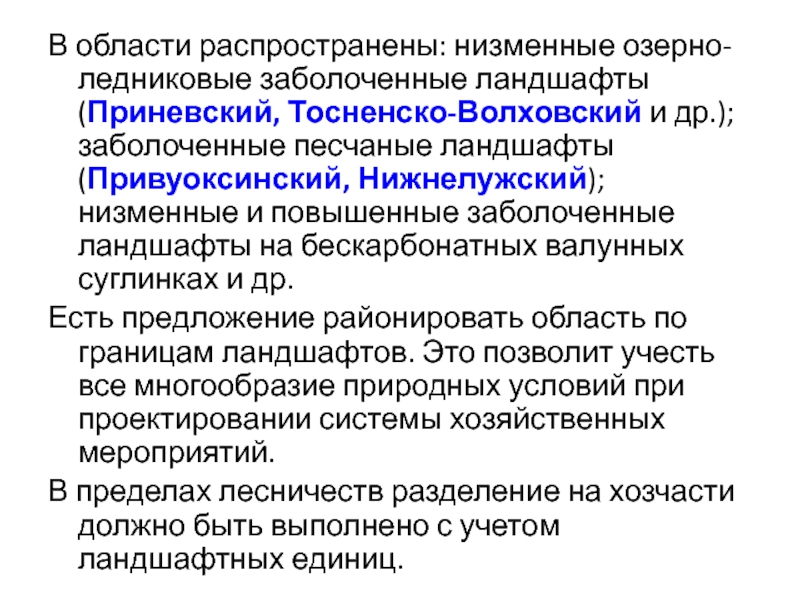 Слайд 33В области распространены: низменные озерно-ледниковые заболоченные ландшафты (Приневский, Тосненско-Волховский и