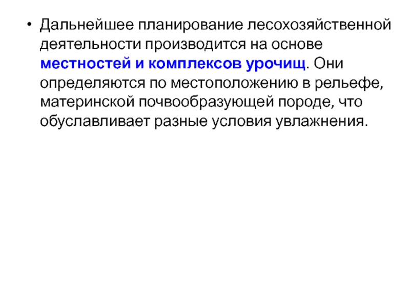 Слайд 20Дальнейшее планирование лесохозяйственной деятельности производится на основе местностей и комплексов