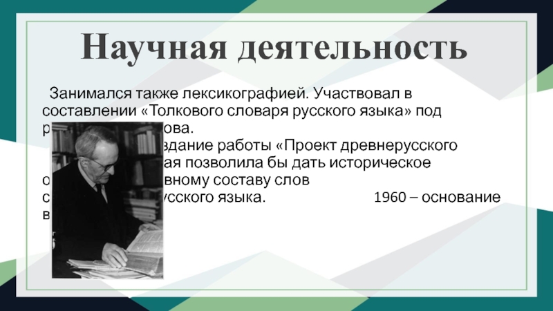 работы «Проект древнерусского языка», которая позволила бы дать историческое освещение основному составу слов современного русского языка. 1960 – основание в ЛГУ МСК