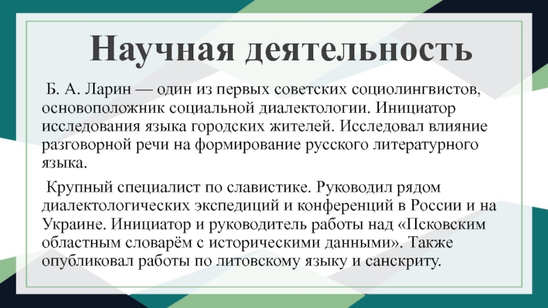 знаний сочетается с мастерством их синтетического применения. Основные труды Ларина — по славянской диалектологии, русской и исторической лексикологии и лексикографии, по украинскому и литовскому языкам; вместе с тем для него не менее значимы разыскания по стилистике художественной речи, а также и переводу произведений словесного искусства. Вместе с тем Ларину свойственно пристальное внимание к социальным и эстетическим функциям языка.