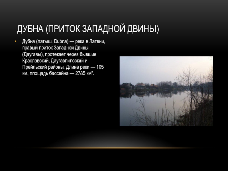 Длина реки — 105 км, площадь бассейна — 2785 км².Дубна (приток Западной Двины)