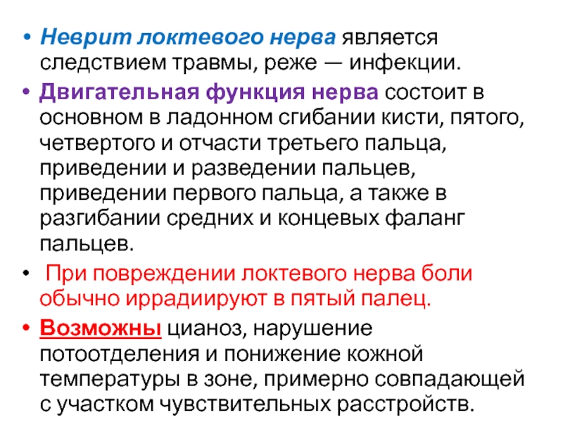 Слайд 28Неврит локтевого нерва является следствием травмы, реже — инфекции.