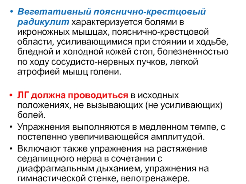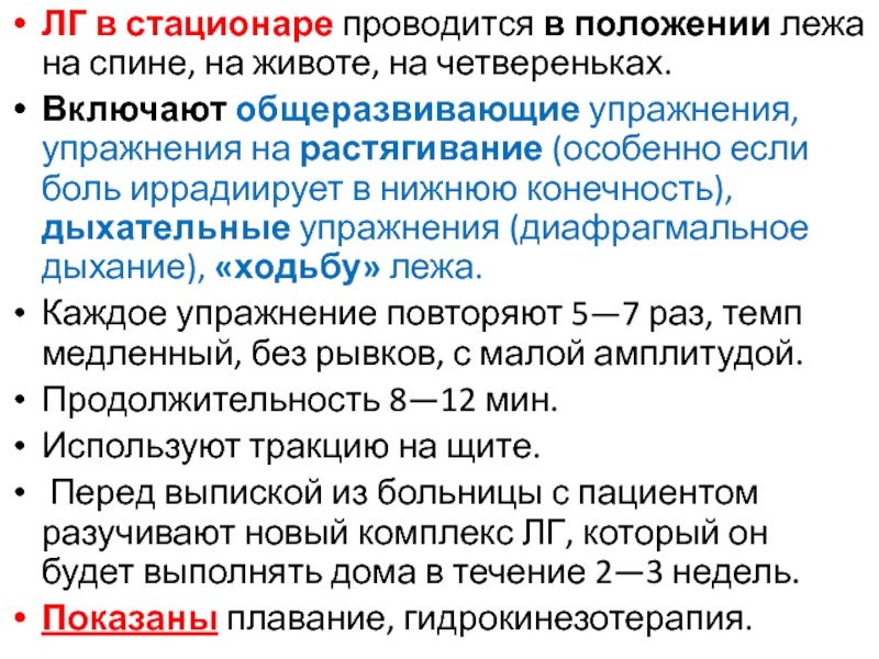 ЛГ проводится после стихания болей в исходном положении лежа, сидя и стоя у гимнастической стенки.
